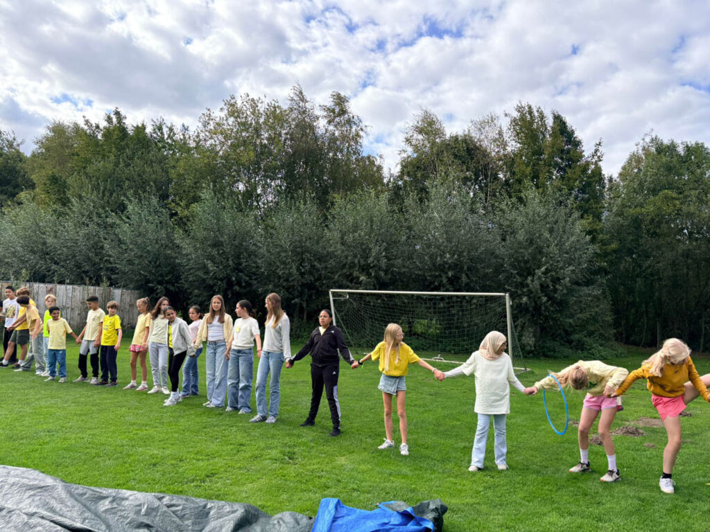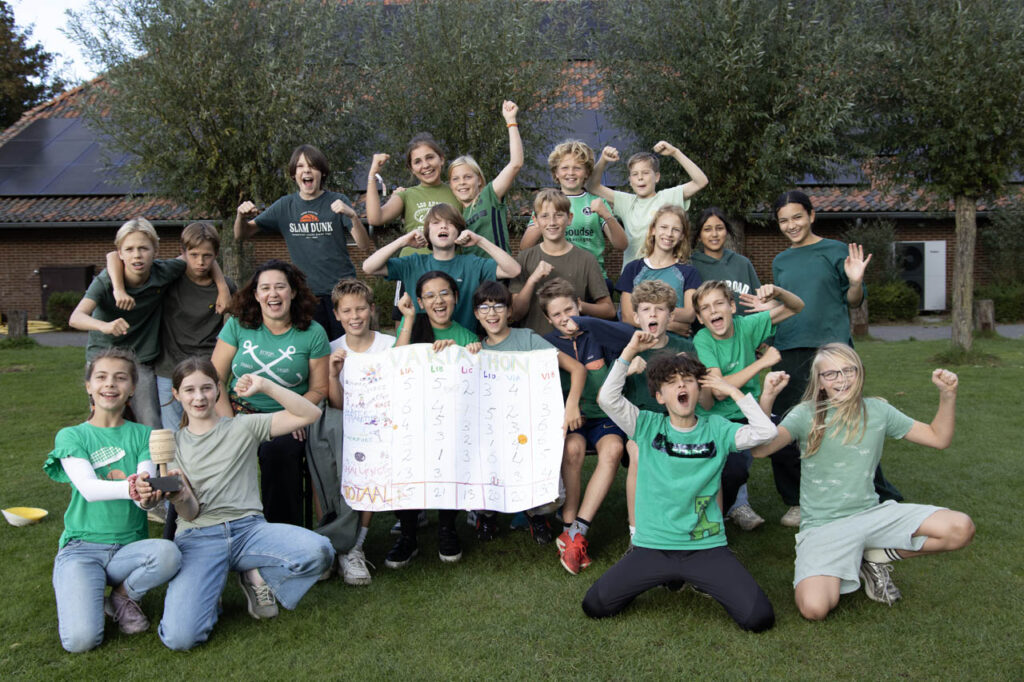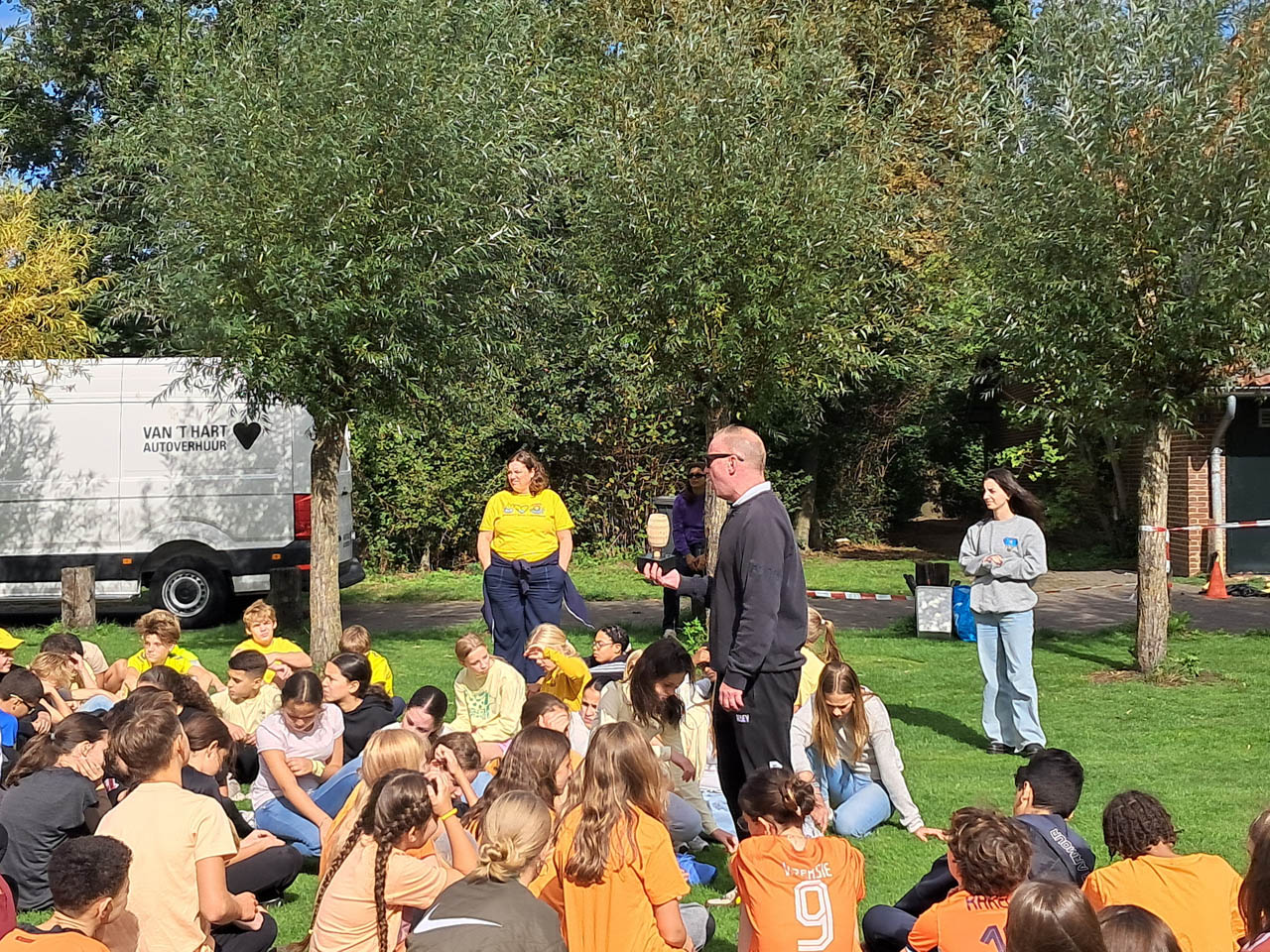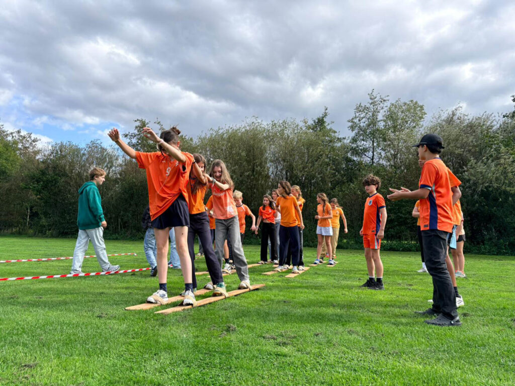 Bij de waterestafette ging het ook om communiceren; als je natte sponzen over een net moet gooien met het doel dat het water uit de sponzen aan de overkant in een bak belandt, is het wel handig om contact te zoeken met een klasgenoot die vangt… Onderdeel 3 waren verschillende challenges: met de hele klas in een cirkel hoepels doorgeven zonder elkaars hand los te laten of een groot zeil omkeren terwijl niemand op het gras mag staan. Ga daar maar eens aan staan! Bij het onderdeel ‘katapult schieten’ werden veel punten gescoord; blijkbaar hebben we te maken met een lichting brugklassers die goed kunnen mikken. Voor 1000 punten draaiden sommige klassen hun hand niet om. Het vijfde onderdeel was de ‘schuifelsteeg’, waarbij een goed ritme (links-rechts-links-rechts) en concentratie de sleutel bleken om zo snel mogelijk met zoveel mogelijk leerlingen het parcours af te leggen. Bij de Abraracourcixrace ging het er niet om wie de naam van dat onderdeel zonder haperen uit kon spreken (dan waren er niet veel punten behaald…), maar om het verzamelen van punten door zo vaak mogelijk op een skippybal, zaklopend, als schilddragers of met een ‘rupsband’ een afstand af te leggen. V1b bleek ook dit jaar de klas die de meeste punten wist te behalen bij deze zes onderdelen. Zij kregen van meneer De Jager de ‘Variaton’ uitgereikt!
