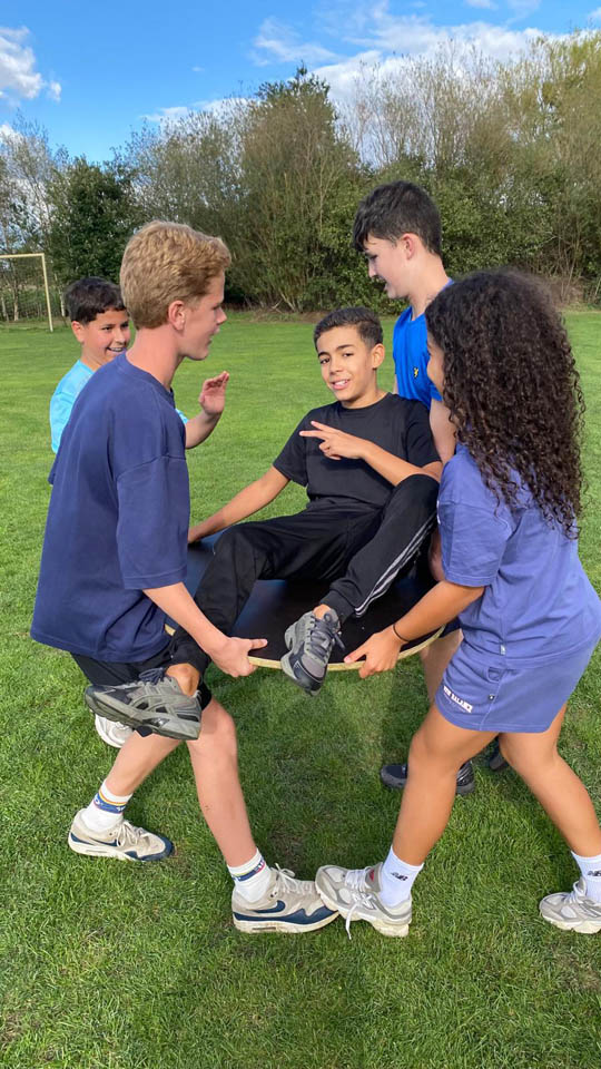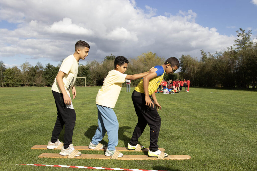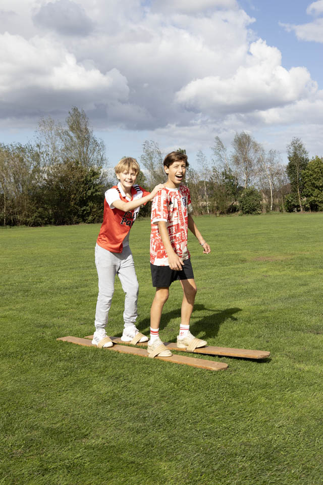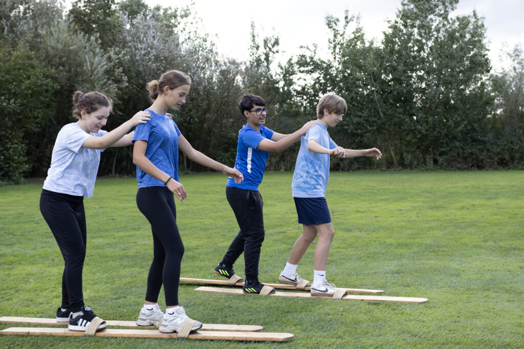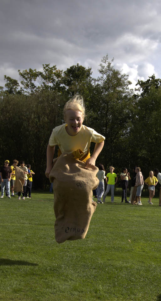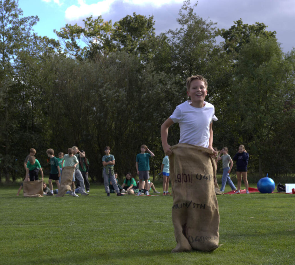 Bij de waterestafette ging het ook om communiceren; als je natte sponzen over een net moet gooien met het doel dat het water uit de sponzen aan de overkant in een bak belandt, is het wel handig om contact te zoeken met een klasgenoot die vangt… Onderdeel 3 waren verschillende challenges: met de hele klas in een cirkel hoepels doorgeven zonder elkaars hand los te laten of een groot zeil omkeren terwijl niemand op het gras mag staan. Ga daar maar eens aan staan! Bij het onderdeel ‘katapult schieten’ werden veel punten gescoord; blijkbaar hebben we te maken met een lichting brugklassers die goed kunnen mikken. Voor 1000 punten draaiden sommige klassen hun hand niet om. Het vijfde onderdeel was de ‘schuifelsteeg’, waarbij een goed ritme (links-rechts-links-rechts) en concentratie de sleutel bleken om zo snel mogelijk met zoveel mogelijk leerlingen het parcours af te leggen. Bij de Abraracourcixrace ging het er niet om wie de naam van dat onderdeel zonder haperen uit kon spreken (dan waren er niet veel punten behaald…), maar om het verzamelen van punten door zo vaak mogelijk op een skippybal, zaklopend, als schilddragers of met een ‘rupsband’ een afstand af te leggen. V1b bleek ook dit jaar de klas die de meeste punten wist te behalen bij deze zes onderdelen. Zij kregen van meneer De Jager de ‘Variaton’ uitgereikt!